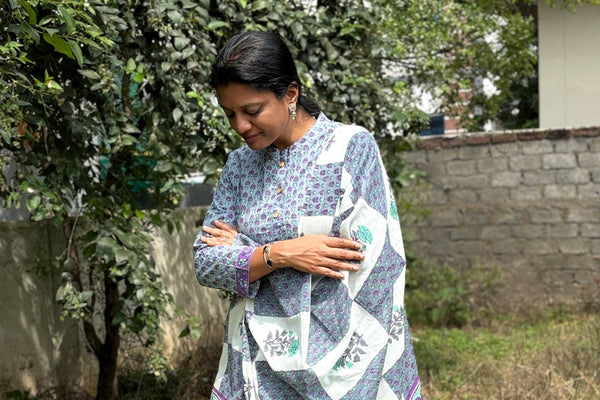 Soft Grey and Lilac Hand Block Printed Cotton Lehenga Set