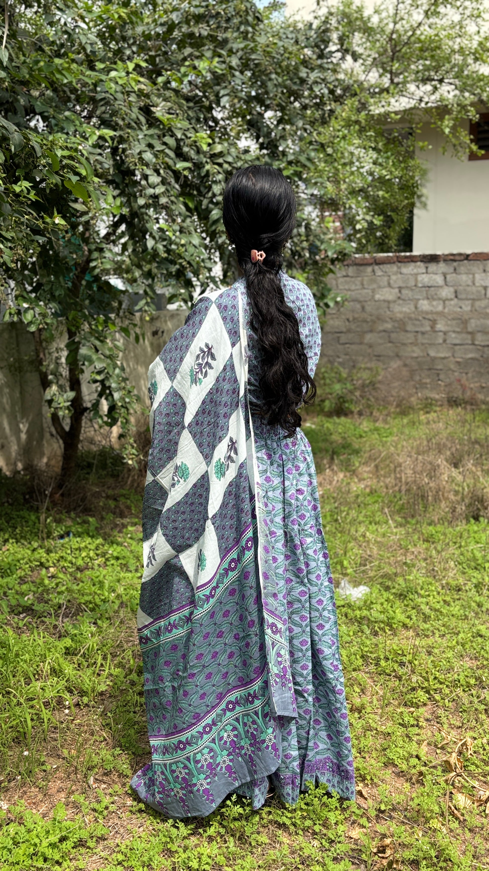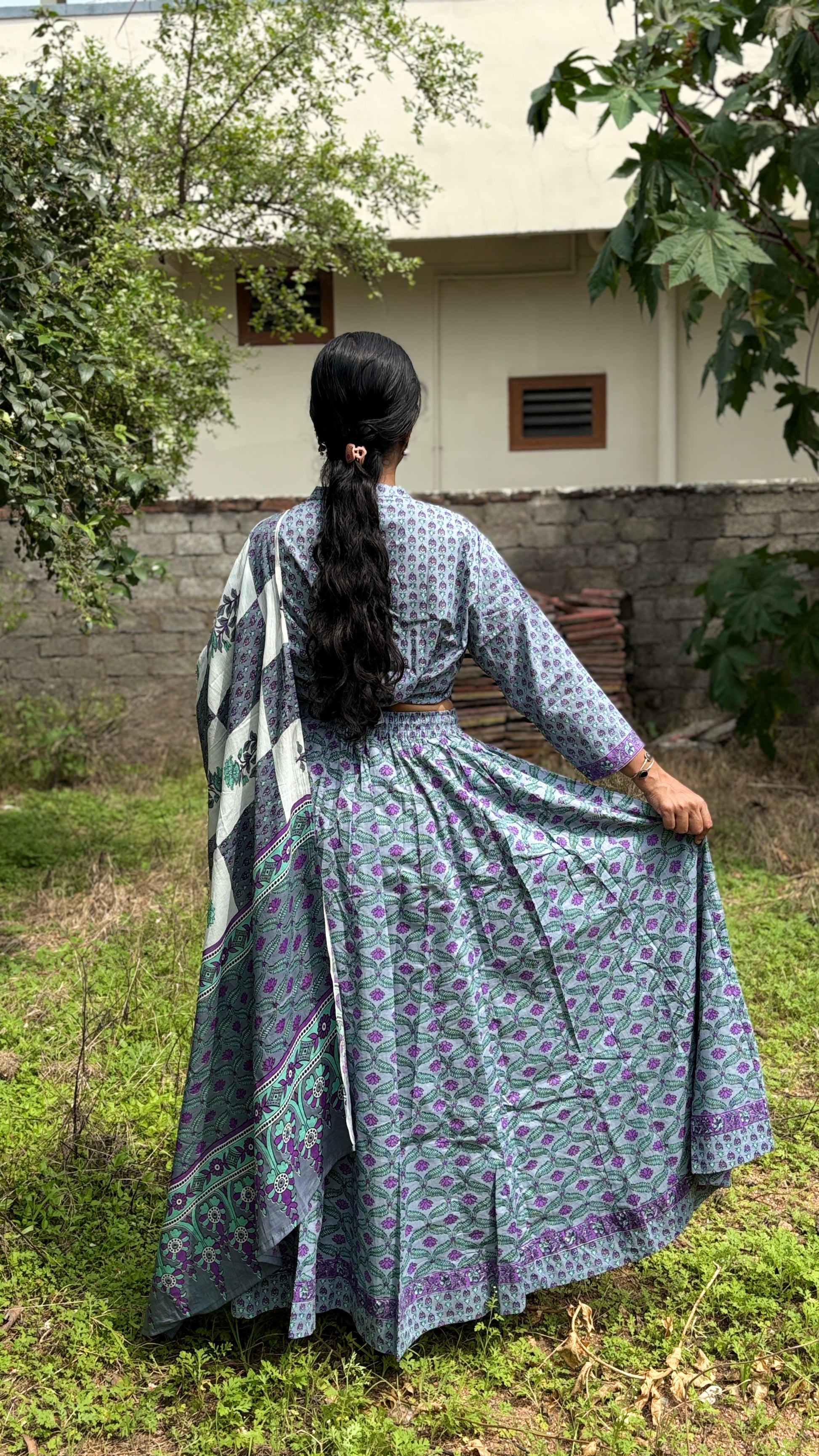 Soft Grey and Lilac Hand Block Printed Cotton Lehenga Set